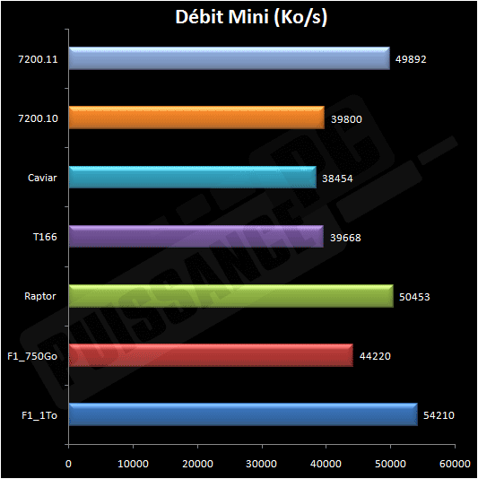 La hiérarchie précédente est à nouveau de mise ici avec toutefois une meilleure tenue en fin de disque du Raptor (plateaux courts) qui devance le F1 750Go et le 7200.11. Les 3 autres protagonistes se tiennent dans un mouchoir de poche.
