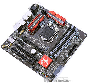 Pas d’innovation côté design, c’est du vu et revu ce mélange de rouge et marron noir associé depuis quelque temps au terme gaming. La où GIGABYTE pèche c’est sur le placement du premier slot PCIe 3.0 x16. Ne pas pouvoir monter un ventirad à moulin de 140mm sur une carte Gaming peut sembler étrange. D’un autre côté, le µATX appelle à l’utilisation de boîtiers de tailles plus réduites qui ne permettent pas forcément d’accueillir ce genre d’engins. Soyez donc prévenus.