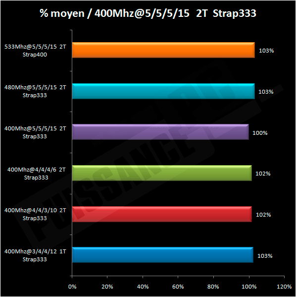 Crysis semble apprécier fréquence mémoire mais aussi à un moindre niveau latence comme le démontre le léger retard du mode 400Mhz en 5/5/5 et 533Mhz mais Strap 400. A nouveau, force est de constater que les écarts sont très limités avec 3 images par secondes entre les 2 valeurs extrêmes. Récapitulons nos benchs via une moyenne pondérée exprimée en pourcentage par rapport à la valeur du réglage 400Mhz 5/5/5 :