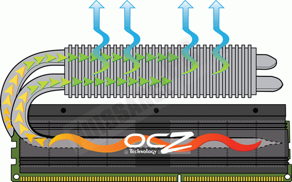 Le principe est simple, augmenter la surface d’échange pour le refroidissement des puces. Comme l’espacement entre les barrettes est limité sur les cartes mères, pas d’autres choix que d’augmenter la surface d’échange "par le haut". OCZ utilise donc ici un radiateur additionnel surplombant les barrettes et en liaison via un caloduc avec les dissipateurs latéraux recouvrant les puces. Ainsi, ce radiateur additionnel n’est pas en liaison directe avec les puces mais avec les radiateurs latéraux qu’il refroidit par conduction thermique comme expliqué par le schéma ci-dessous.