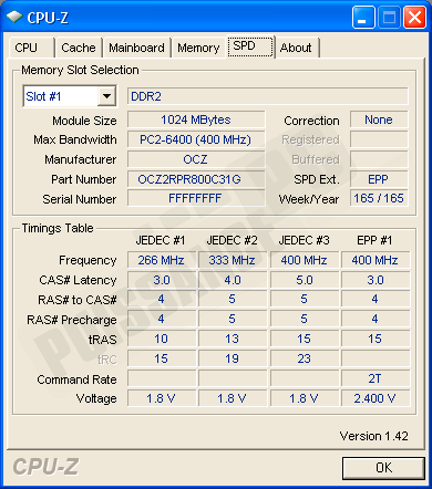 Voyons le Serial Presence Detect ou SPD toujours avec CPUZ. Les normes Jedec 266, 333 et 400mhz à 1,8v (tension de référence pour la DDR2) sont bien présents, tout comme un profil EPP destiné aux chipsets nForce. On retrouve ici le fameux CAS3 mais avec 2.4v et 2T…