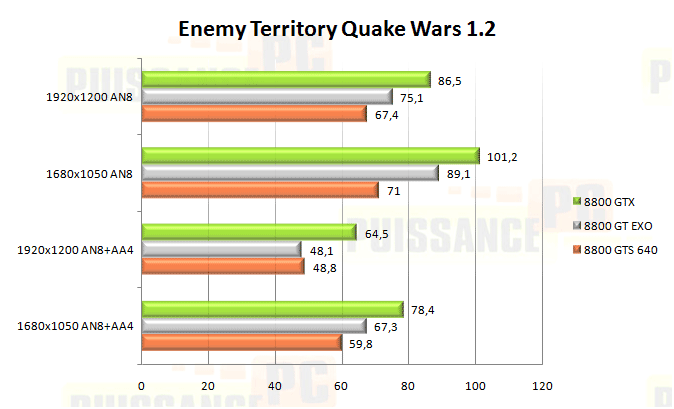 Le test suivant sera réalisé sur le petit dernier d’ID software, introduit avec Doom3, baptisé originalement Doom 3 Engine puis amélioré au fil du temps et dont le dernier titre en date à s’en servir est le fameux multijoueurs Enemy Territory : Quake Wars. Profitant des raffinements de DirectX9, l’usage du megatexturing pompe allégrement dans la mémoire de la carte.