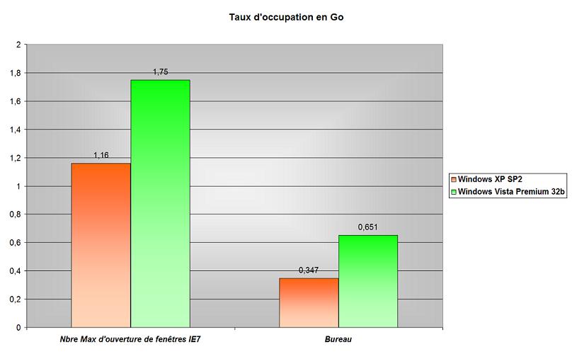 Une fois arrivé sur le bureau lors du premier démarrage, nous avons mesuré la quantité de RAM occupée par le système d’exploitation: 347Mo sous XP et 651Mo sous Vista, pas de doutes Vista seul est gourmand, et nous comprenons pourquoi Microsoft conseille 1Go de mémoire vive au minimum pour installer Vista.
