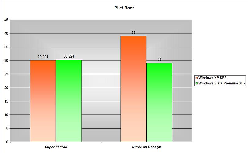Pi ne semble faire aucune distinction entre XP et Vista, égalité donc à ce niveau. Nous avons chronométré la durée de boot, du moment ou l’on appuie sur l’interrupteur jusqu’à ce que Windows soit complètement chargé. Le résultat est sans appel, Vista démarre bien plus vite et c’est un réel plaisir de voir que l’on a franchement évolué de ce côté ci malgrès des machines plus complexes. L’avantage du boot plus rapide éclipse une compression plus lente. La compression/décompression est une tâche CPU quotidienne, comme lors de la lecture d’un fichier zippé, mais la « lenteur » sous Vista est un phénomène transparent pour l’usager: Vista gagne donc ce chapitre.