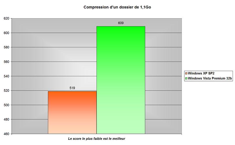 Et comme vous pouvez le voir, cette action s’est révélée plus longue sous Vista de 90 secondes. Est ce du à l’OS directement ou à un fonctionnement moins optimisé de winrar, toujours est-il que c’est plus long sous Vista. A noter que la tâche de compression sur des éléments plus petit (d’usage plus courant), il n’y aucune différence.