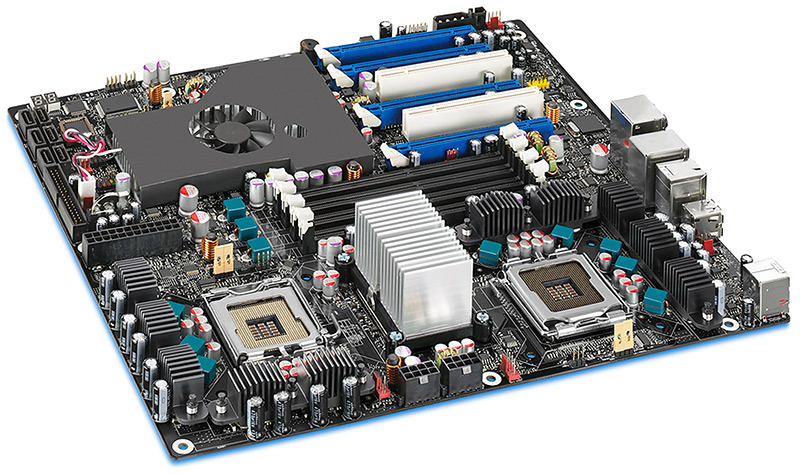 Le site HotHardware a pu obtenir quelques clichés d’une version qui semble définitive de la carte mère d’Intel qui sera à la base de ce fameux Skulltrail: la DX5400XS. La carte arbore un impressionnant refroidissement actif pour refroidir le southbridge et les 2 chips Nvidia nForce 100 MCP. Pas moins de 4 ports PCIe 16X sont disponibles et la carte supportera le SLI, Intel a acheté à Nvidia la possibilité d’utiliser le SLI sur une de ces cartes mères, mais une seule… cette DX5400XS.