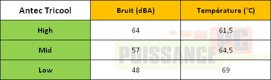 Comme nous pouvions nous y attendre, les Tricool décrochent la meilleure température de ce comparatif avec 61.5° seulement quand ils sont en +12V à 2100tpm, mais également la 2è meilleure performance avec 64.5° à 1650tpm en mode "Mid". Les niveaux sonores sont par contre élevés avec un assourdissant 64dBA à 10cm pour le mode High et un 57dBA désagréable en Mid. Ici nous estimons que même en Mid un boîtier ne parviendra pas à étouffer totalement le bruit des Tricool même en vitesse intermédiaire.