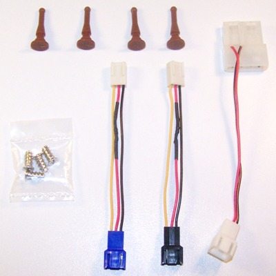 Voici le bundle livré avec le ventilateur. En plus des patins on retrouve donc 4 vis pour les installations plus classiques ; un adaptateur 3pins vers molex pour ceux qui souhaiteraient brancher directement le ventilateur sur leur alimentation ; et enfin les 2 modules permettant de réduire la vitesse de rotation du NF-P12: le Low Noise Adaptator (LNA) en noir et l’Ultra Low Noise Adaptator (ULNA) en bleu.