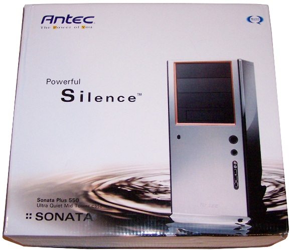 Comme à son habitude (cf. notre test du NSK4400 par exemple), Antec a soigné l’emballage de son Sonata Plus 550. La boîte ne met pas vraiment en valeur la référence du boîtier qui est écrite en tout petit, et l’appartenance à la série Sonata est à peine plus visible. Antec mise avec cet emballage sur la promotion et l’attrait du public pour le silence, avec une mention "Powerful Silence" qui saute aux yeux.