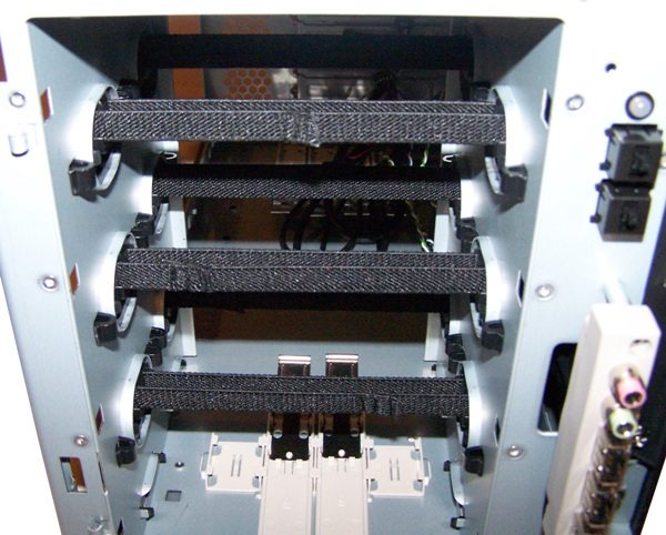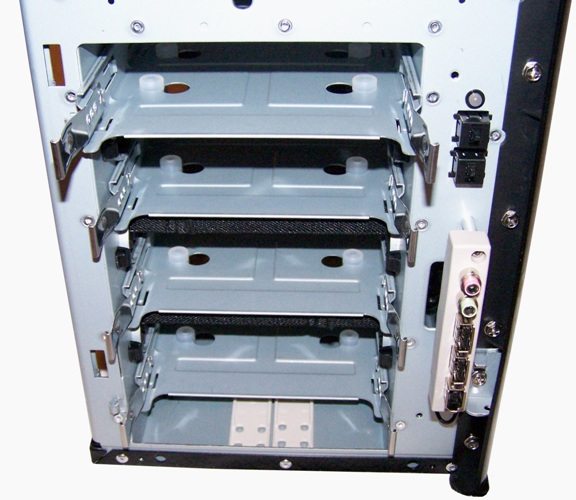 Nous voici maintenant en présence de la cage à disque durs. 4 rails sont présents permettant d’accueillir autant de disques 3"5, avec des fixations à vis mais sur rondelles épaisses en silicone pour limiter les vibrations. Un système qui a fait ses preuves et très apprécié par exemple dans le P182 d’Antec.
