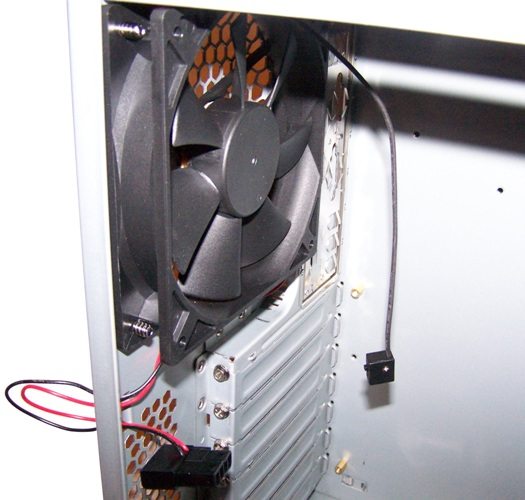 Comme souvent chez Antec, la ventilation est assurée par un Tricool 120mm. Placé à l’arrière de la tour il est à alimenter avec une prise molex de l’alimentation. Un petit interrupteur permet de choisir entre 3 vitesses: L (low, 1200tpm), M (Middle, 1600tpm) et H (High, 2000tpm).