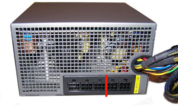 Voici maintenant l’arrière de notre alimentation. Au lieu de la classique sortie de tous les câbles par le même orifice, ici seuls les câbles principaux sortent directement de l’alimentation (prise ATX etc…). Pour ce qui est des prises SATA, des molex ou des alimentations PCIe pour cartes graphiques ce sont des câbles livrés séparément, et vous ne branchez que ceux qui vous sont nécessaires à l’arrière de l’alimentation dans les prises 6 pins prévues à cet effet, et qui sont au nombre de 5.