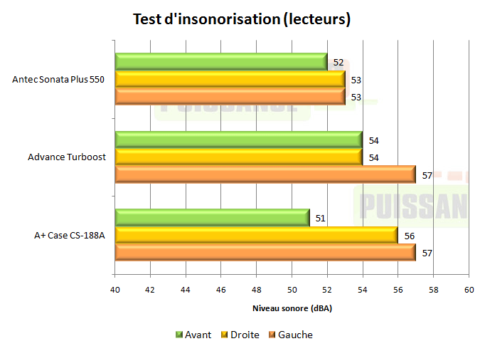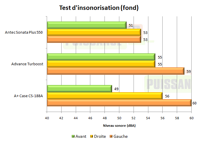 Le CS-188A emporte néanmoins les mesures de face, grâce à sa porte épaisse qui coupe une partie du bruit. De côté le fait que les Turboost et CS-188A soient percés pour pouvoir placer leur ventilateur de 25cm ne les aide pas, mais la raison n’est pas à chercher que là: les parois latérales du Sonata Plus 550 sont également de bien meilleure qualité et doublées d’un composant insonorisant.