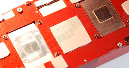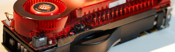 Bien sûr dual slot, le refroidissement de la carte est assurée par un ventilateur radial de 80mm repris des HD2900XT (ne criez pas, on ne vous entendra pas), avec un système totalement fermé donc pour expulser en dehors du boitier le flux d’air quelque peu échaudé par des pixels taquins, en transitant par deux radiateurs dédiés à chaque processeur. Pour ne pas alourdir d’avantage la carte (et la facture ?), AMD a opté pour deux matériaux différents. Le premier, situé le plus près du ventilateur, est en aluminium tandis que le second est en cuivre. Ainsi, le radiateur en aluminium, moins conducteur, profitera d’un flux d’air plus frais et légèrement plus intense tandis que celui en cuivre absorbera mieux la chaleur dégagée du second GPU mais sera probablement moins bien refroidi. Un choix plutôt judicieux.