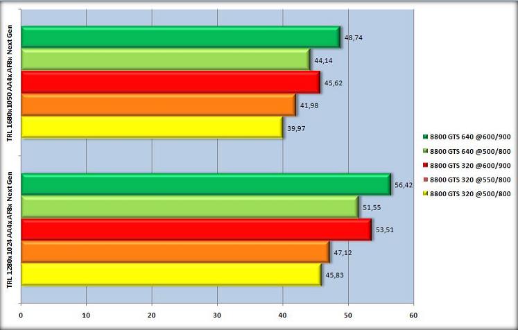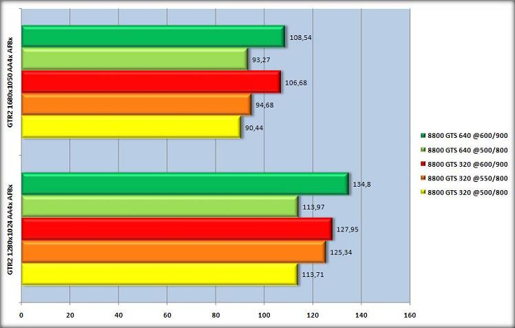 Aucun moyen de départager les adversaires du jour sous GTR2, ni par les fréquences de fonctionnement, ni par les résolutions et filtres. GTR2 est tout bonnement fluide et beau partout. A noter en 1280 le trés bon résultat de la BFG qui offre quasiment autant de performances qu’à 600/900/1400, preuve que l’overclocking n’a pas toujours un réel impact ingame (les 3DMark ne sont pas des situations ingame).