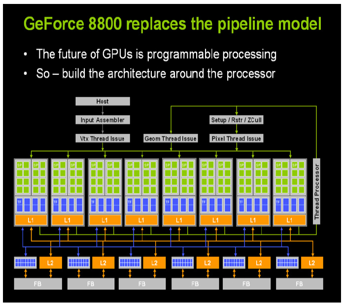 Les architectures utilisées jusqu’auxGeForces de 7ème génération où aux Radeons 9000 reposent donc en gros sur un bon équilibre entre les différentes unités de traitement pour qu’un pixel passe des unes aux autres de la manière la plus fluide possible, donc sans latences. C’est là qu’intervient le concept d’architecture unifiée, consistant à utiliser une même unité de calcul pour n’importe quel traitement -qu’il soit de type pixel ou vertex par exemple. Au niveau pratique, les shader cores des radeons X1000 vont déjà dans ce sens et l’évolution vers l’architecture unifiée sera naturelle sur le R600. Chez Nvidia par contre, c’est table rase.