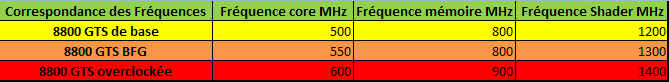 Pour les tests, nous avons utilisé la 8800 GTS 320Mo aux fréquences de base des autres modèles, puis aux fréquences d’usine de BFG, puis aux fréquences overclockées arbitrairement choisies de 600MHz pour le core et 900MHz pour la mémoire. La 8800 GTS 640Mo a été benchée aux fréquences de base soit 500 MHz et 800MHz, puis à 600 MHZ et 900 MHz. La fréquence des shader est corrélée à celle du core, résumons :