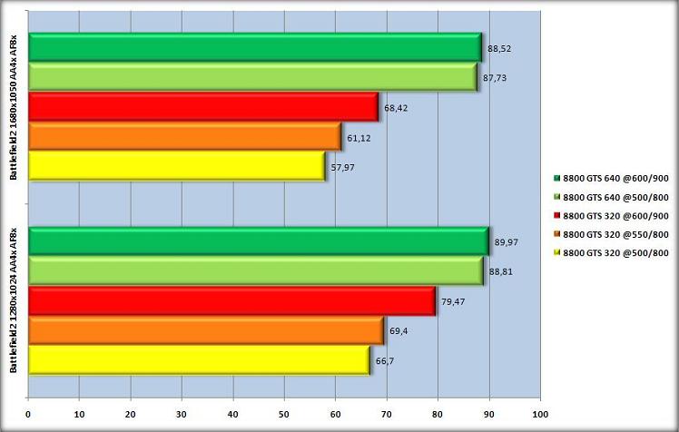Et bien malgrés tout, Battlefield 2 dans les conditions de test semble être plus à l’aise avec 640MO que 320. Le fossé se creuse bien plus en 1680, mais le jeu reste parfaitement fluide en toutes circonstances et avec un framerate qui ne chute pas sur notre config de test.