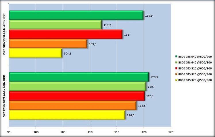 Jusqu’en 1280×1024, toutes les cartes se tiennent, malgrés la lourdeur de la scène choisie. La donne change un peu en 1680 ou la 8800 GTS 320 Mo se fait distancer par le modèle à 640Mo, la BFG étant overclockée d’usine propose des résultats meilleurs que les 8800 GTS de base, grâce notemment à la fréquence des shader qui est à 1300MHz. Toutefois, même en 1680, il est difficile à l’oeil nu de départager les candidates tant le niveau de performances atteint est impressionnant.