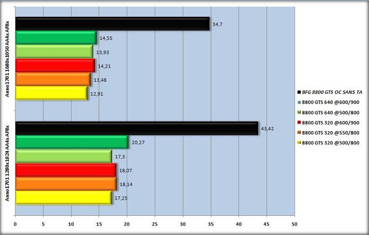 Concernant Anno1701, des explications s’imposent. Devant le faible résultat de toutes les cartes indépendamment de la quantité de ram, nous avons pensé en premier lieu à une limitation par le CPU. Cependant, un X2 4800+ tournant à 2750MHz ne peut expliquer à lui seul des résultats aussi catstrophiques. Aussi nous avons désactivé le transparent antialiasing super échantillonage qui est, je vous le rappelle (voir configuration de test) activé à TOUS les benchs. Nous l’avons désactivé , conservé un antialiasing classique, et testé avec la BFG : les résultats parlent d’eux mêmes. L’impact jusqu’à présent peu violent du TA sur les benchs est tout d’un coup extremement pénalisant sur ce jeu. En 1680, le jeu devient forcémment plus agréable et jouable sans attraper la myxomatose. Donc plus de peur que de mal, nos 8800 ne sont pas encore obsolètes.