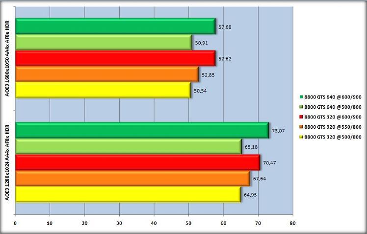 320 ou 640 Mo? Age of empire 3 ne vous aidera pas à choisir étant donné que les cartes se comportent de façon identique pour les mêmes fréquences. De base la BFG se place au dessus niveau performances. Egalité donc ici.