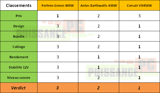 Le constat est sans appel, et la Corsair VX450W emporte haut la main la plupart des critères listés. Le seul où elle termine dernière est le prix, mais comme nous l’avons précisé sur sa fiche les 10€ qui la séparent de la Fortron Green 400W ou de l’Antec Earthwatts 430W nous semblent parfaitement justifiés.