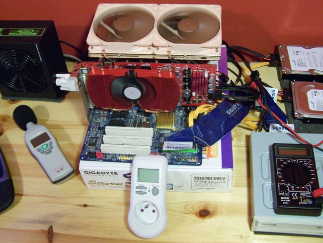 A noter que pour limiter le niveau sonore de la configuration pour ne pas fausser les mesures pour les alimentations, les NF-P12 sont alimentés via l’utilisation de modules ULNA et tournent donc à 900tpm seulement, tout comme le Zalman VF1050 de la 8800GT, lui aussi alimenté via un ULNA de Noctua.