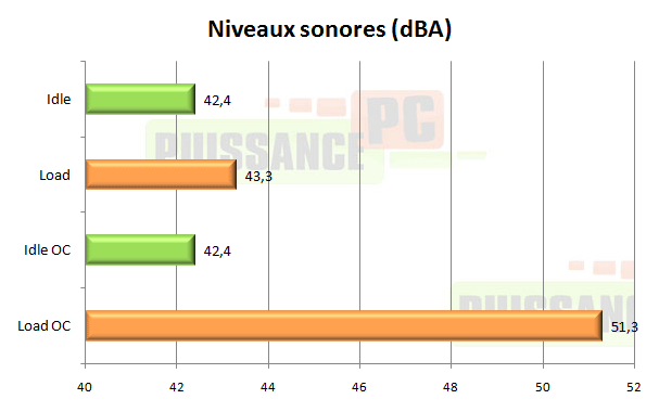 En pleine charge nous avons constaté deux situations très différentes. Lors des tests en charge avec notre configuration non overclockée, le niveau sonore n’a quasiment pas bougé et l’alimentation est restée très silencieuse. Par contre une fois la configuration overclockée la thermorégulation de la Earthwatts a fait s’envoler le nombre de tours par minute et le petit ventilateur de 80mm est alors devenu particulièrement bruyant et désagréable.
