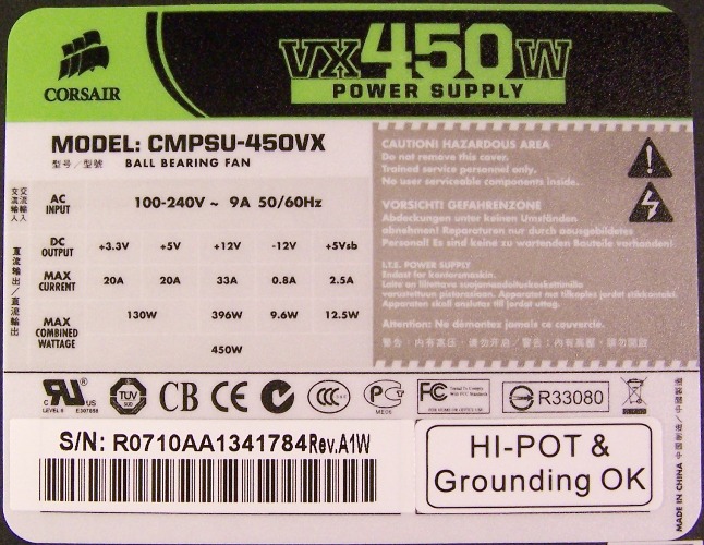 L’alimentation malgré le prix n’a pas subi les affres de la limitation des coûts, et c’est donc une belle robe noire que revêt la VX450W. Un autocollant vert reprend également le logo de la marque et la référence de l’alimentation, pour un résultat avec le ventilateur noir profond assez classieux. Cette alimentation ne dénotera donc pas dans une configuration travaillée esthétiquement et avec paroi en plexiglas.