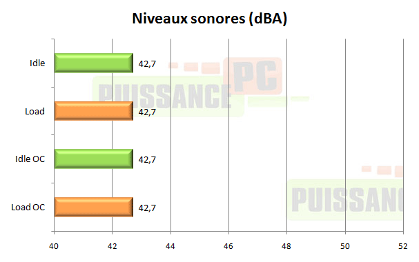 Il ne s’agit pas non d’une erreur de notre part, la VX450W a bel et bien affiché exactement le même niveau sonore de 42.7dBA lors de tous nos essais, en idle comme en pleine charge et avec overclocking comme sans. Un niveau sonore de plus silencieux à souhait.