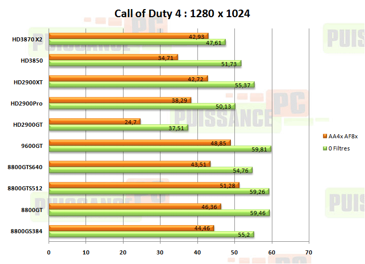 - Analyse : c’est sensiblement le même cas de figure que GOW. Les Nvidia 8800 ainsi que la 9600GT dominent sans filtres quelle que soit la résolution. En revanche l’application de filtres nivelle un peu les performances, ce qui permet à la X2 de venir dépasser les 8800, certes de très peu. On notera les difficultés de la HD2900GT, la plus grande aisance du HD3850 malgré ses 256Mo de mémoire, et la trè bonne tenue de la 8800GS. La HD3850 256Mo dépasse l’ancien haut de gamme HD2900XT équipé de 512Mo de mémoire, preuve que le travail paye chez AMD.