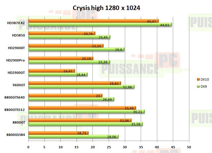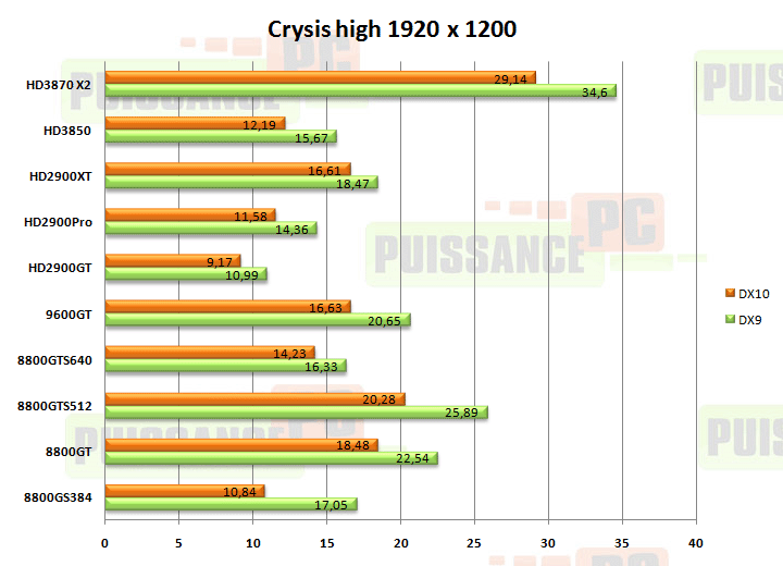 - Analyse : Cela se passe de commentaires. Non? bon ok! Juste un petit mot alors. La X2 est la carte qui booste Crysis quel que soit le mode, en ne perdant pas de vue pour les grincheux qu’il n’y a pas de filtres antialiasing ni d’anisotrope. Actuellement aucune carte, du moins en 1920 ne peut se permettre le luxe de briller avec des filtres sur un tel niveau de réglages. Crysis en "medium", c’est du même niveau que Far Cry en very high, donc ça a le gout de la "next gen" sans en avoir la saveur, impensable. Ensuite, DX9 très à l’aise, DX10 gros mangeur d’énergie. A ce point que jouer confortablement n’est possible que sur une poignée de cartes, toutes celles qui se promènent au dessus de la limite des 30 images par seconde.