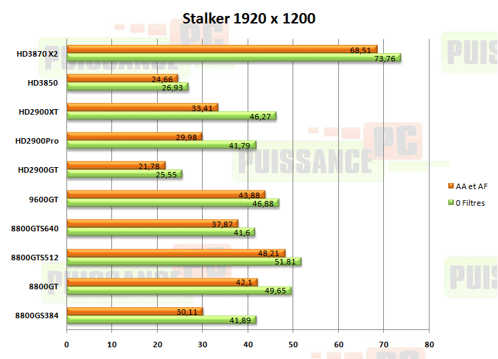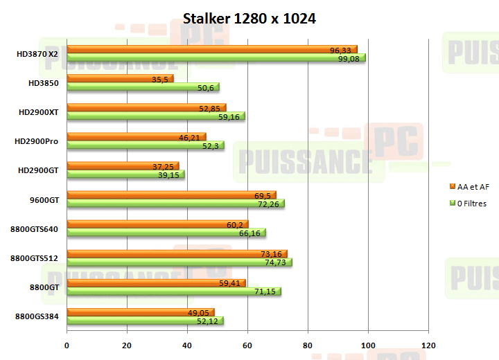 - Analyse : en 1280, nous sommes plutôt dans le domaine du CPU limited, et hormis les faiblesses des cartes HD2900, les 8800 et 9600GT nous rappellent que la limite du processeur est atteinte. Le HD3870 X2 est intouchable, et c’est normal à la vue de la puissance affichée par cette carte "monocrossfire". En 1920, l’application de filtres ne change pas fondamentalement le classement, le bus 192 bits de la 8800GS étant ici inadapté à cet usage. Dans l’ensemble, nombre de cartes dont le segment ne les destinait pas à afficher du 1920 se débrouillent assez bien. Les HD2900 souffrent toujours autant de la présence de filtrage antialiasing.