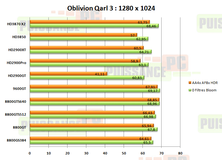 Oblivion, où le renouveau de Bethesda. Sorti il y a quasiment 2 ans maintenant, ce jeu continue de ravir la communauté Elder Scrolls. Graphismes colorés avec une vraie personnalité, mais une carte géographique vaste et cohérente, Oblivion n’en a pas moins été une torture pour les cartes graphiques. A cette époque, les X1900 et les 7900GTX se disputaient le leadership. Qu’en est-il maintenant avec les deux générations de cartes suivantes? Les réglages sont de deux types : sans filtres, les détails sont tous à fond dans les options, et le Bloom est choisi comme lumière d’ambiance. Dès que l’on met des filtres, le Bloom cède sa place au HDR, et on force l’AA4x et l’AF8x dans les options des pilotes.