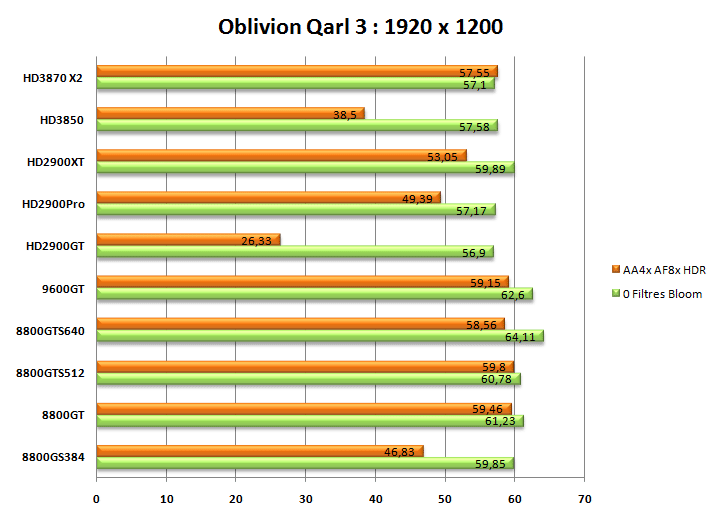 - Analyse : En 1280, y’ a t-il une personne qui n’a pas encore compris le sens du mot CPU limited? Une chose est sure, toutes les candidates n’éprouvent aucune difficulté à faire tourner le jeu, hormis peut être la HD2900GT, et encore cela n’impacte pas le plaisir de jouer. En 1920, sans filtres, les cartes là aussi sont très à l’aise, il n’y a qu’avec les filtres que les premières différences apparaissent. Les deux cartes pourvues de 256Mo de ram sont à la traine, mais une fois de plus, ces cartes ne sont pas destinées à cette résolution et encore moins à ce niveau de détail. Pour excuse, le pack de textures Qarl 3 nécessite en théorie une carte de 512Mo minimum.