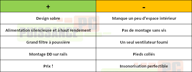 Le Sonata III est un boîtier qui mérite son succès actuel auprès des consommateurs. Il offre pour 100€ un boîtier à la conception simple mais pratique avec de bonnes idées comme le filtre à poussière amovible ou les cages à disques durs très accessibles. Il offre également, même si c’est très limite, juste ce qu’il faut comme place intérieure. On aurait tout de même aimé avoir quelques centimètres de plus en profondeur comme en hauteur.