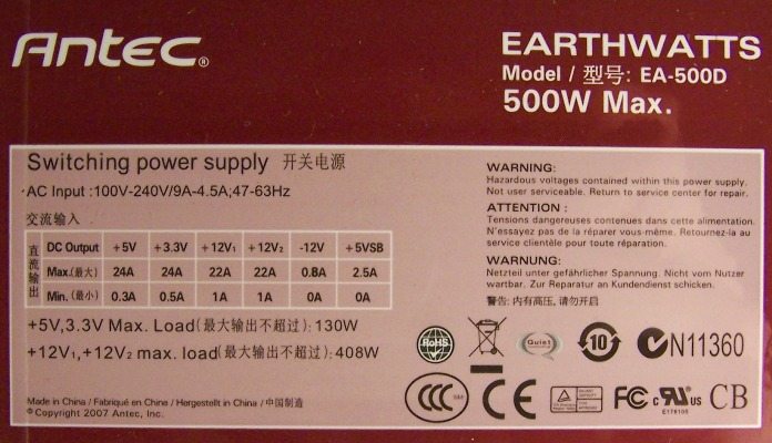 L’alimentation présente dans le Sonata III est une Earthwatts 500W, une référence qui s’est fait une place depuis quelques temps désormais dans la catégorie des alimentations pas trop chères, silencieuses, et avec un rendement optimal. Nous avons d’ailleurs testé la version 430W de la Earthwatts lors de notre comparatif d’alimentations de 400 à 450W, où elle a confirmé son potentiel, potentiel que la Earthwatts 500W ne peut qu’améliorer avec plus de puissance encore disponible.