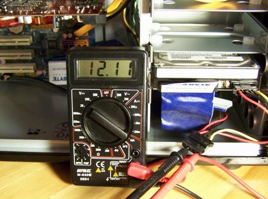 Nous avons terminés nos mesures par l’étude de l’alimentation. Nous avons pour cela relevé tout d’abord les tensions des rails de +5 et +12V avec notre configuration de test au repos (bureau Windows) puis en pleine charge (processeur + carte graphique).