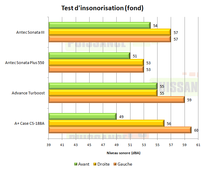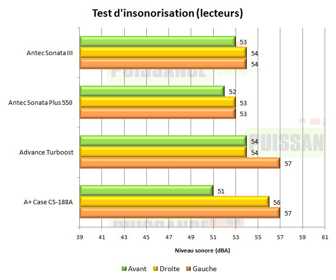 Le Sonata III offre de bonnes prestations sonores avec la source du bruit placée au niveau des lecteurs ce qui semble indiquer que sa structure à ce niveau là est bien robuste et comparable à celle du Sonata Plus, mais par contre la donne est bien plus mitigée lorsque la source se trouve au fond du boîtier. Le Sonata III se retrouve alors plus proche des boîtiers premiers prix que sont les Advance Turboost et A+ Case CS-188A, mais ce n’est pas en soit une si grande surprise que cela car le boîtier du Sonata ne prétend pas en lui-même être un modèle de grande qualité. Vendu à 100€ avec une alimentation qui vaut 70€ et un ventilateur qui en vaut 10, le Sonata III ne mise pas sur un boîtier très haut de gamme. Le résultat est donc finalement plutôt satisfaisant bien qu’un bon cran en dessous du Sonata Plus.