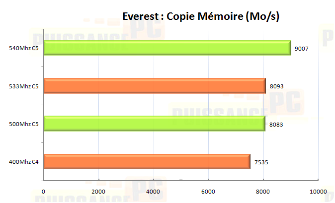 On poursuit les tests en s’intéressant à la copie mémoire. Là encore le couple FSB450/RAM540 ne laisse aucune chance aux autres réglages, par contre c’est beaucoup plus serré entre la RAM à 533Mhz Strap 400 et la RAM à 500Mhz strap 266, preuve de l’influence notable de ce paramètre. Derrière la RAM synchrone est lâchée malgré son Command Rate 1T :
