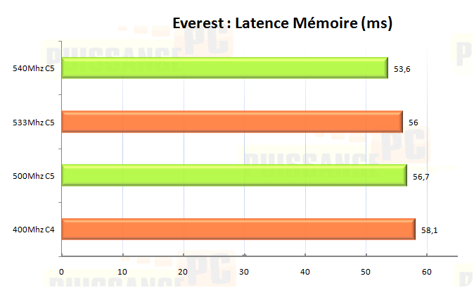 Pour finir avec les tests synthétiques, on mesure la latence (la valeur la plus petite est la meilleure). La fréquence RAM est le paramètre le plus influant, néanmoins le FSB et le Strap jouent également un rôle notoire.