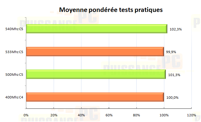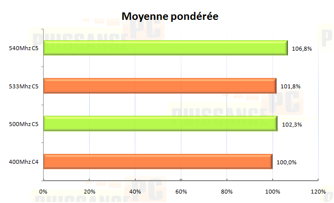 Tout d’abord une moyenne pondérée de chaque test exprimé en pourcentage par rapport au résultat du réglage de référence à base de PC6400 c’est à dire FSB400 et RAM synchrone. On constate que le réglage utilisant un FSB450 prend un avantage de près de 7% sur le réglage de référence et domine largement les autres qui peinent à dépasser les 2% de gains.