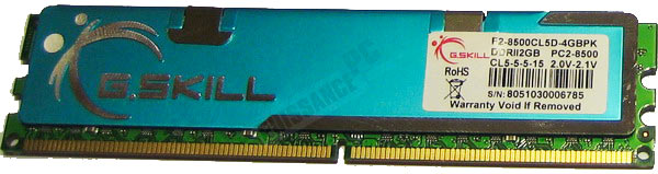 Si on s’attarde plus sur chaque barrette, on retrouve le sticker G.Skill rappelant là aussi fréquence, timings, et tension de certification. Nous avons donc droit là aussi à un classique 5/5/5 sous 2.1v. Tout comme les OCZ, un PCB plus assorti à la couleur des radiateurs eut été encore plus harmonieux. Ceci dit, une fois au fond du boitier cela a bien peu d’importance.