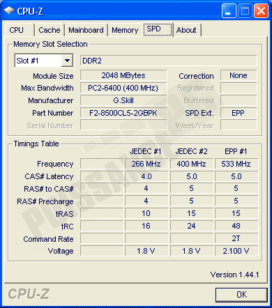 Finissons par le SPD de nos barrettes : G.Skill ne s’est pas donné la peine de programmer le profil 333Mhz, ceci dit sur des PC2-8500 est-ce bien important? Tout comme le kit OCZ, les timings des normes Jedec sont relativement relâchés et le mode 533Mhz n’est programmé que dans un profil EPP. La barrette est là aussi reconnue comme de la PC2-6400…