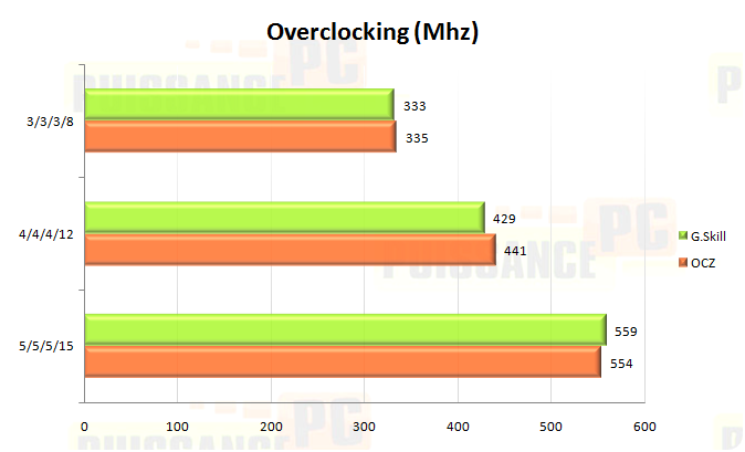 Voyons les résultats. Tout d’abord avec la série agressive, les 2 Kits font jeu égal avec une fréquence proche de 333Mhz (PC2-5300) ce qui est un peu décevant mais pas catastrophique. En passant à 4/4/4 on gagne tout de même la bagatelle de 100mhz et le Kit OCZ prend un ascendant d’une dizaine de Mhz. Avec les timings les plus relâchés, on atteint près de 560mhz avec le G.Skill qui prend cette fois sa revanche sur l’OCZ plafonnant 5Mhz plus bas. Reste que le gain par rapport à la certification PC2-8500 (533Mhz) est fort limité…