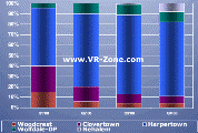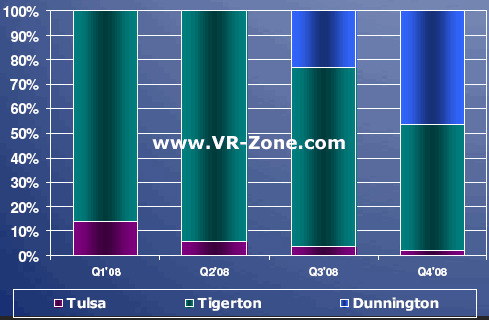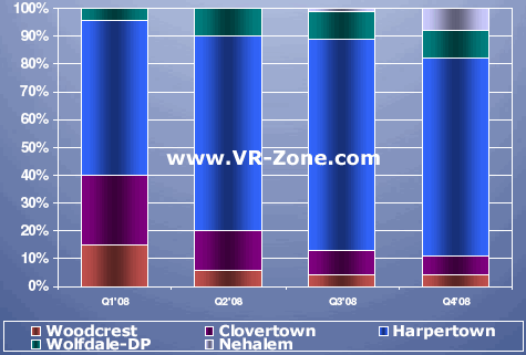 VR-Zone est parvenu à mettre la main sur des slides certainement en provenance d’Intel, et indiquant les parts de mises en vente des processeurs de la firme par segment au cours de l’année 2008. Ainsi sur le segment "Expendable", que représentent les processeurs Tusla et Tigerton, on peut voir que l’apparition du Dunnington, le Penryn 6 core, devrait intervenir au 3è trimestre de l’année, avec une proportion de ventes franche puisque de plus de 20% dès le lancement, atteignant même 45% des ventes en fin d’année. Du côté du segment "Performance", celui-ci va être de plus en plus dominé par les Xeon 5400 puisqu’Intel prévoit jusqu’à 75% des ventes du segment par cette série au 3è trimestre. Le 3è trimestre verra également le lancement du Nehalem, mais dans une infime proportion au commencement, 1 ou 2%. Au 4è trimestre la production devrait commencer à être réelle pour atteindre 8% des ventes du segment.
