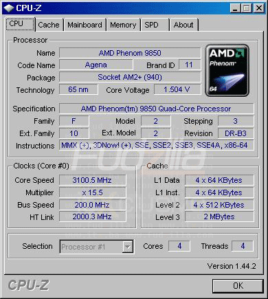 Hardware.fr a pu tester un Phenom 9850 Black Edition. La dénomination 50 signifie que le processeur est en révision B3, et donc débarassé du bug TLB qui a tant miné les ventes et la réputation. Le 9850 BE signifie encore que les coefficients sont débloqués en montée et en descente, histoire de peaufiner l’overclocking. Enfin, il tourne à la fréquence de 2.5GHz avec 64Ko de cache L1 pour chaque core, 512 Ko de cache L2 pour chacun des core, et 2Mo de cache L3. Les performances sont meilleures, et à fréquence égale le B3 fait mieux que le B2. Question overclocking, ce n’est pas encore la panacée, mais c’est mieux puisque HFR a réussi un 2.8 GHz stable. A noter que Fudzilla a réussi lui, à tenir un 3.1 GHz à 1.5V. Preuve s’il en était que ça va mieux, mais sera-ce suffisant? Les images de l’exploit en page 2 de cette news!