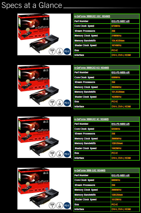 Le fabricant de cartes graphiques EVGA vient d’annoncer le pasage de sa gamme 9800GX2 1Go à quatre modèles, dont trois overclockés d’origine. On retrouve tout d’abord la e-GeForce 9800GX2, modèle de référence cadencé à 600/1500/2000 (gpu/shaders/ram). Vient ensuite la 9800GX2 SC qui a elle un très léger overclocking GPU avec 625MHz, ainsi qu’au niveau des shaders avec 1562MHz. La GDDR3 demeure à 2000MHz. La 9800GX2 KO, comme chaque fois chez la marque est elle le 2è modèle le plus puissant, avec ici 650/1620/2050. Enfin le haut de gamme est lui représenté par la fameuse série SSC, avec un overclocking à 675/1674/2100. Des fréquences qui talonnent donc celles de la 9800GTX (675/1688/2200), et comme les GPUs sur les 2 cartes sont des G92 dotés de 128 Stream Processors, on peut en déduire que cette petite 9800GX2 SSC aura à un rien près les performances d’un SLI de 9800GTX, impressionnant tout de même… (Source: VR-Zone)