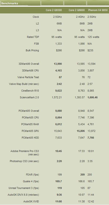 En effet, le Q6600 est l’ennemi à abattre pour le Phenom 9850BE. Mais comme le Q6600 arrive en fin de vie, le Q9300 qui le remplace dans la gamme de performance et de prix devient lui aussi l’ennemi à abattre. Maximum PC a testé les 3 processeurs sur des applications diverses comme les jeux, les benchmarks synthétiques, les applications plus ou moins courantes. En règle générale, le 9850 talonne vraiment le Q6600 et se fait un peu plus distancer par le Q9300. Ce dernier distance d’autant le Q6600. Dans les jeux, selon le titre, le 9850 se fait assez distancer, mais il y a un mais : la résolution de test n’est pas annoncée, il y a fort à parier qu’elle doit être en 1024 maximum pour expliquer ces écarts. Sur des grosses résolutions, nous sommes dans le domaine du GPU limited et les valeurs seraient largement nivellées. Il n’empêche que si le Phenom 9850 est le melleur Phenom actuellement, et qu’il fait quasi jeu égal avec le Q6600, c’est bien le premier Phenom à jouir d’une bonne image, surtout qu’il est proposé à 200€ sur les sites de VPC français.
