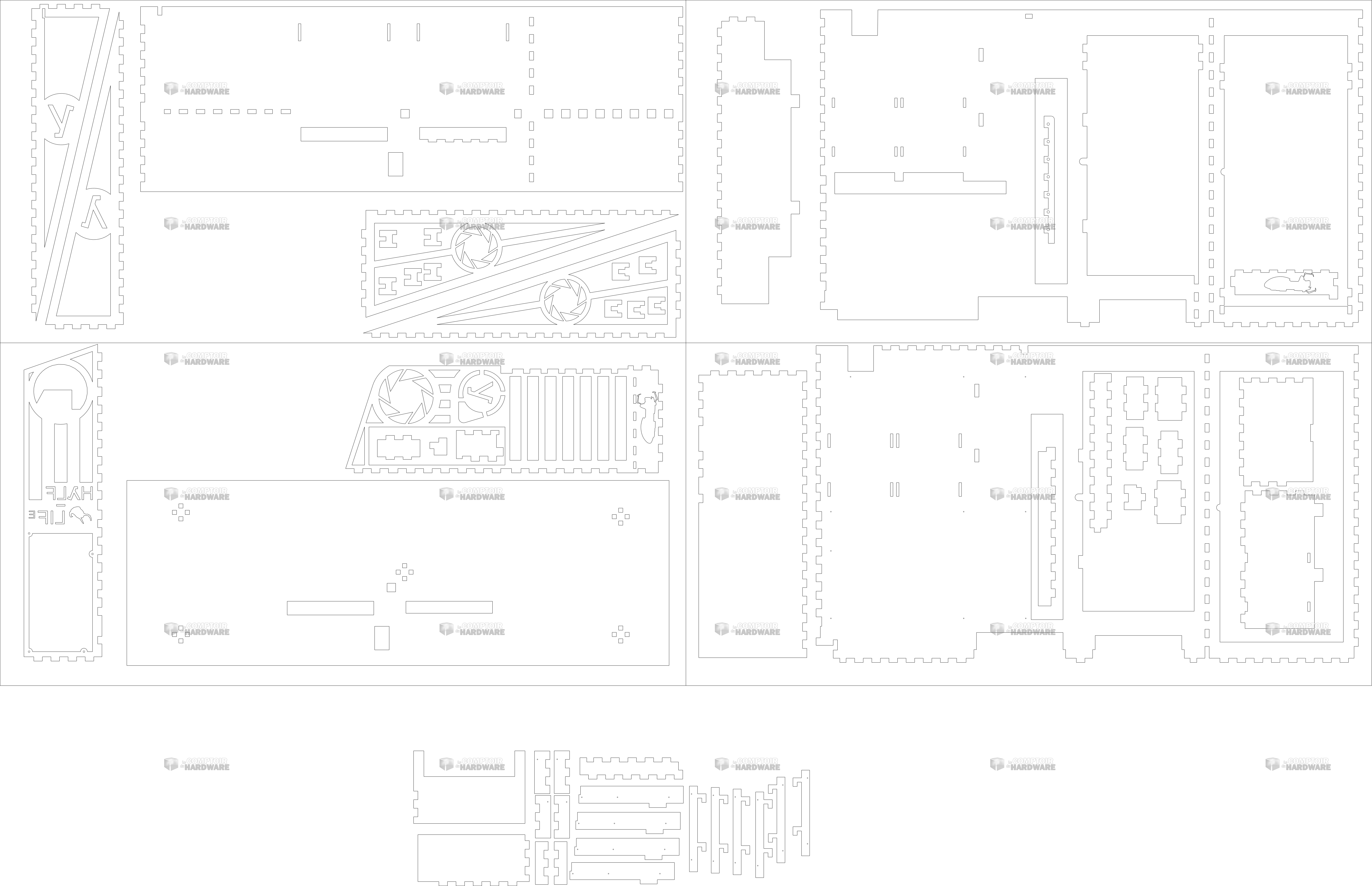 Par rapport à la première version, le radiateur de 280 est passé parallèle à la carte mère, dans un soucis d’esthétique de la façade. Étant un aficionado d’une certaine série de jeux (vous devinerez laquelle facilement), quelques logos se sont incrustés dans les équerres. L’un d’eux, trop fin, est par ailleurs modifié depuis les rendus 3D (mais corrects sur le plan). Il m’est par ailleurs possible de graver des motifs dans les espaces libre, bien que je n’ai pas vraiment d’idée à ce sujet (sans surcharger l’ensemble). Peut-être une bannière CDH ? L’idée générale est de garder un ensemble relativement sobre, c’est pourquoi mon choix de matériau s’est porté sur du bois (contreplaqué Okoumé 5mm) et du MDF de 3mm pour certaines pièces fines, qui sera traité à l’huile de lin sous les conseils avisés de Guillaume. C’est également pour cette raison que les néons sont coffrés, et dont la lumière sera peut-être diffusé par du papier calque. Ceci dit, le choix du liquide de refroidissement n’a pas encore été tranché, peut être 1/2 eau distillé, 1/2 liquide de refroidissement de voiture orange ?